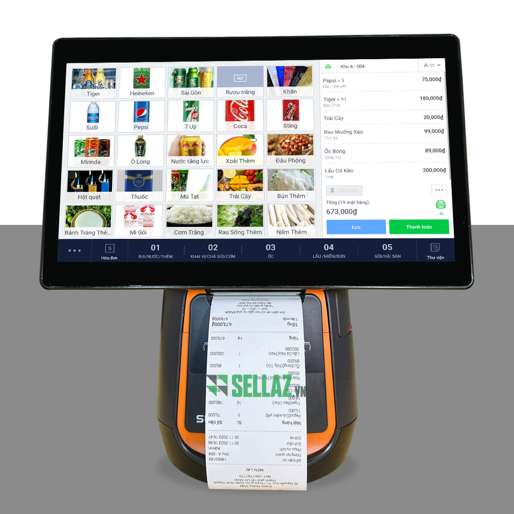 Với màn hình lớn 14 inch và máy in tích hợp, thiết bị này giúp tối ưu không gian và thao tác bán hàng nhanh chóng.